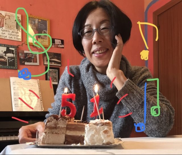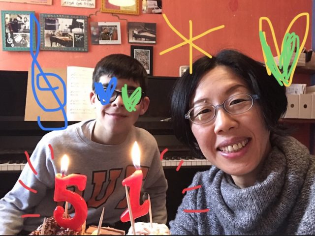 「クンプレアニョス・フェリス〜!」「やったー!」勝手に盛り上がる私たち。それから改めてピアノに向かう。順序が逆?