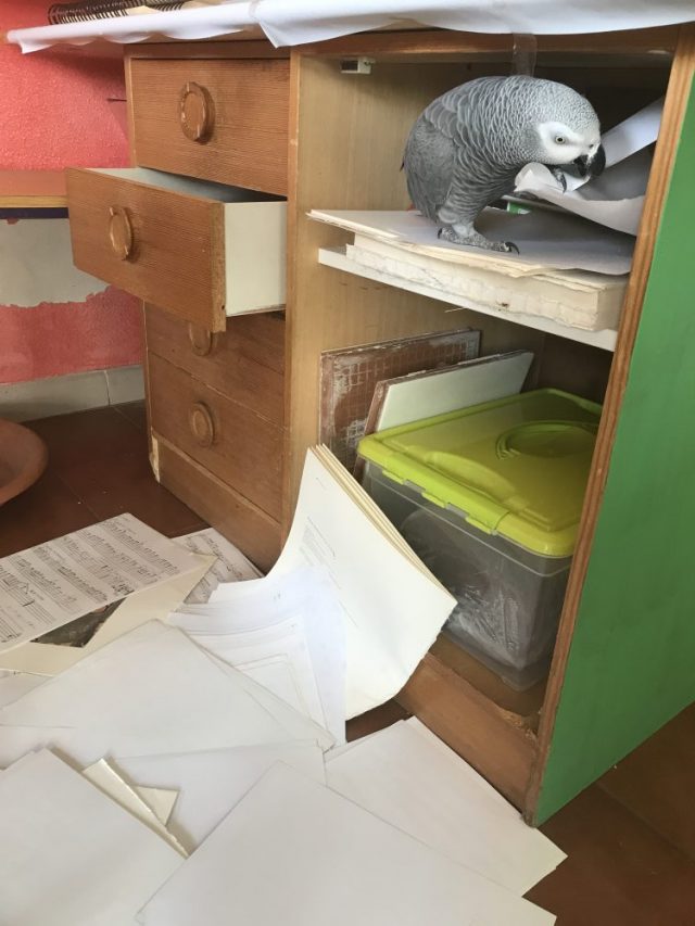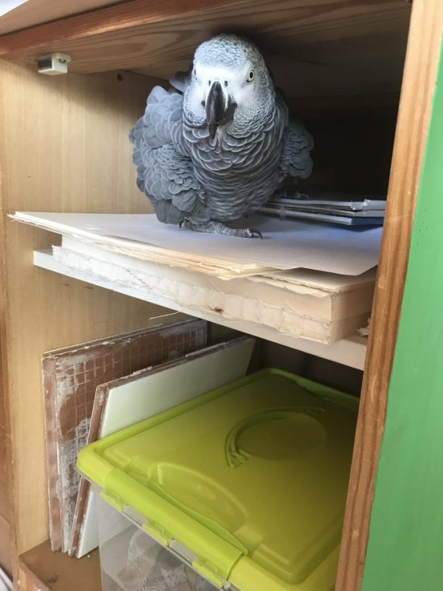 その頃オウムは1人、棚を「巣」に改良中。紙をまき散らしスペース作り。あぁあ。いつも掃除で床にひざまづいてばかり。