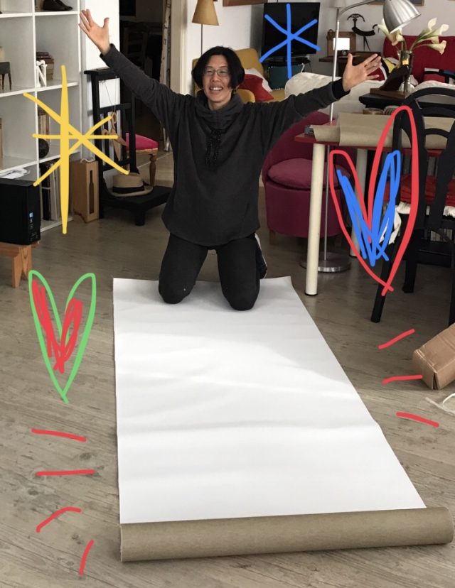 しばし絶句。ゆっくりと床に広げてみる。おぉお。まるで絨毯のよう。ここ全てに描けるなんて夢のよう。