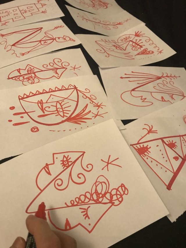 フライトで夜中の2時に帰ってくるハビ吉のベッドへ、描いたばかりの10枚の紙切れをそっと並べる。サプライズにはサプライズで。