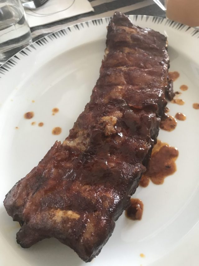 ここでワインの栓を抜く。グラスをかえて再び乾杯。ランチ開始後2時間して、やっと「スペアリブ」が登場。付け合わせは「茹でジャガイモ」。熱々を2種類のソースで。