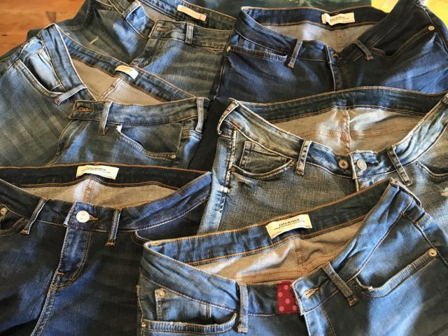 ここ8年間、ためにためたジーンズがこの通り!私の体型に合わせて「股上が浅くなって」生まれ変わりました!(写真)。