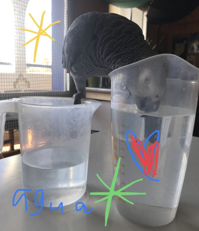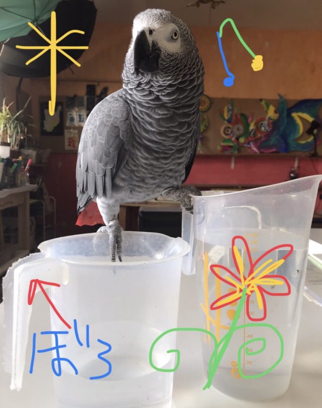 テラスのゼラニウムに水をあげようと「水差し」を準備をした瞬間、それは起こった。お呼びでないオウムの登場。