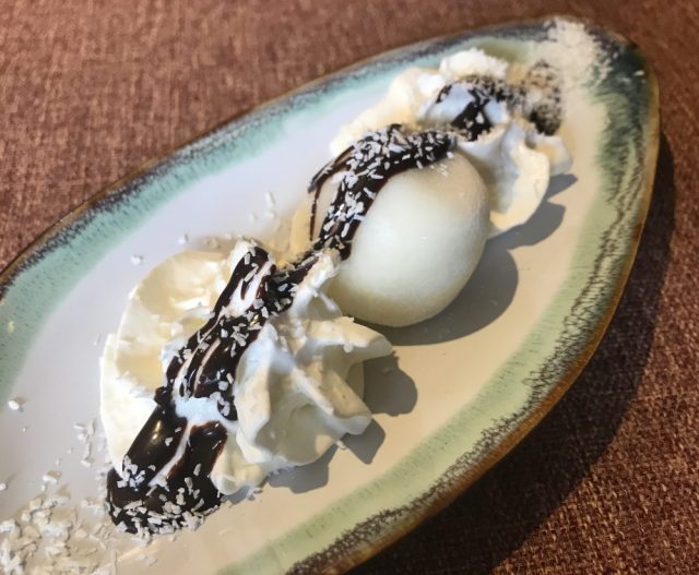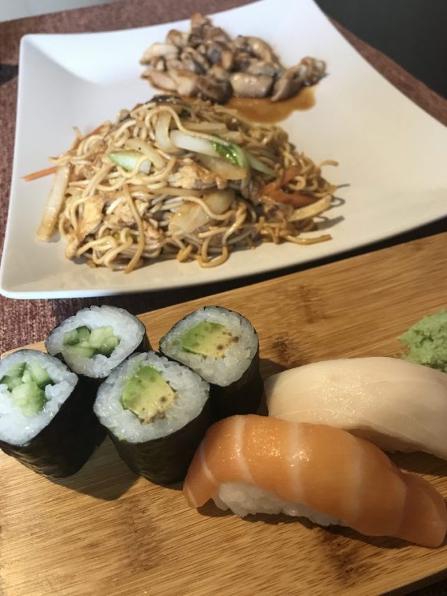 今回、選んでみたのは「寿司、餃子、焼きそば、チキン照り焼き風味」そしてデザートは「もちアイス&生クリーム」。ドリンクは白ワイン。