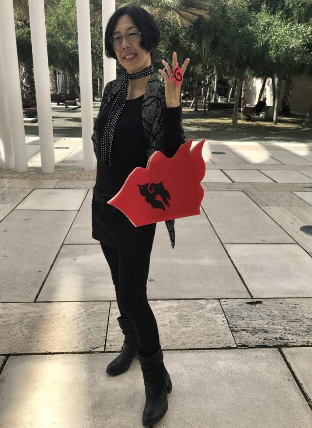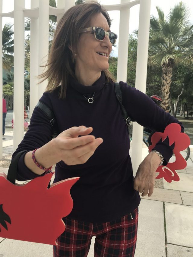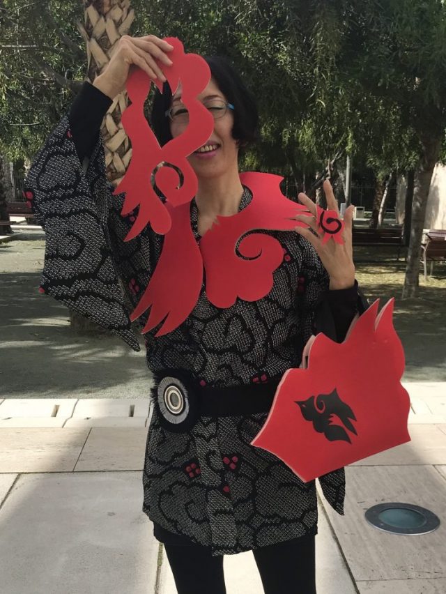 「飛びはねるパシオン(情熱)」たちを小物で表現。カメラマンは友人のカルメン。最後にカルメンにも「パシオン玉」を身につけてもらいました。