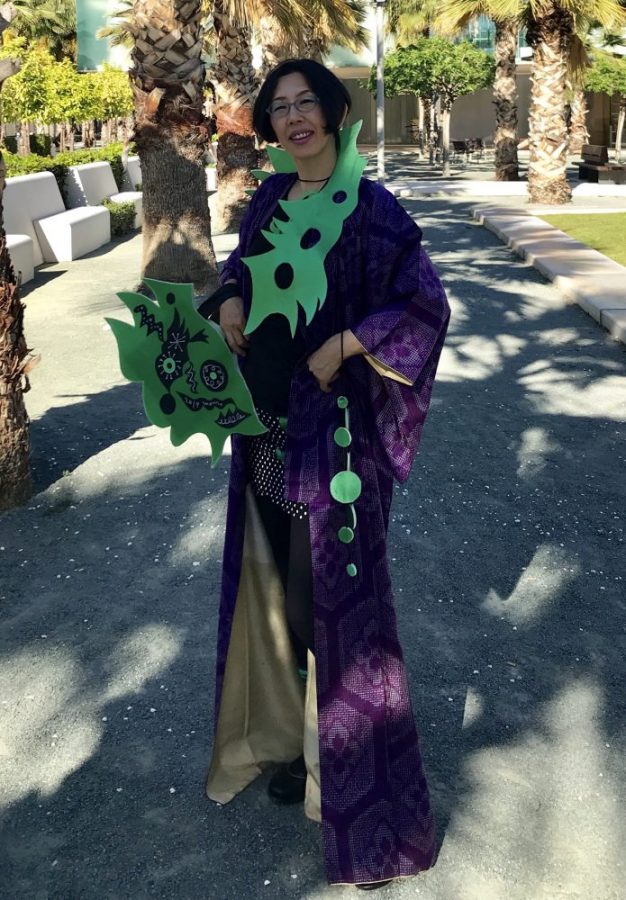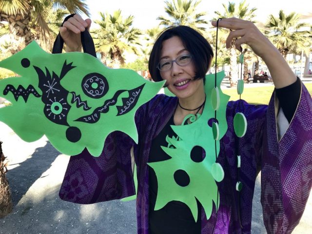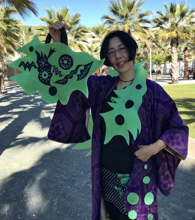 今日のもも衣は、グリーンの小物を「着物&ミニスカート」に合わせてみました。この「緑&紫」はマラガ県の旗の配色。