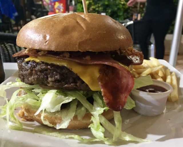 まずはビールで乾杯。特大ハンバーガーセットに食らいつき、うちの前のビーチをそぞろ歩く。夜風が気持ちいい〜。