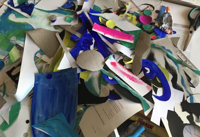 次に、コラージュ用の「パーツ作り」をスタート。まずは大まかにカットして、台紙の上にざらざらっと置いていく。