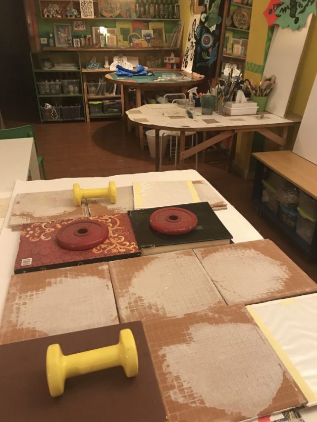 いきなり方針が変わり、作業場を整え直す。まずは台紙となるキャンバス地を100×70センチに再びカットし、テーブルに広げる。