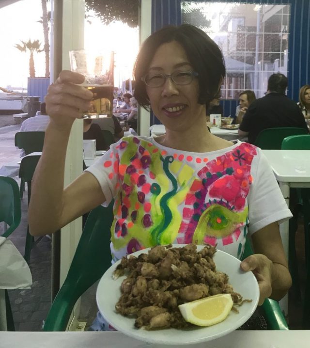 って、最初に注文。ちなみにこのお店、8尾で4ユーロ。焼きたて熱々に、ジュッとレモンを絞って。マラガではフォークを使わず手で食べます。