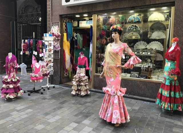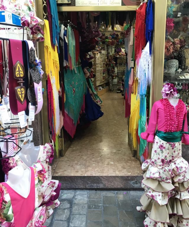 お店のフラメンコ衣装は、本当にすてき。見ているだけで幸せ〜。でも、高くて暑くて固くて重い。四重苦。