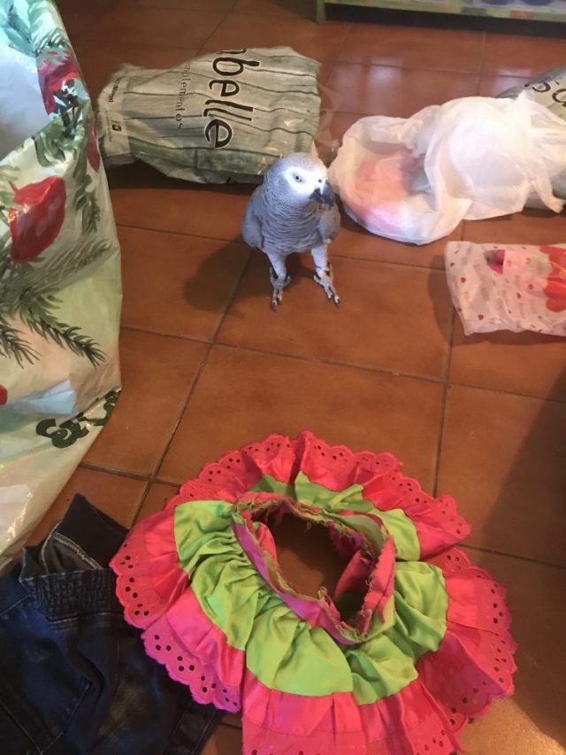 そんなわけで、6つあるテーブルには作業中の衣類が広がり、床には布や袋が散らばっている。いつのまにかオウムの公園に。登ったり降りたり。楽しい?