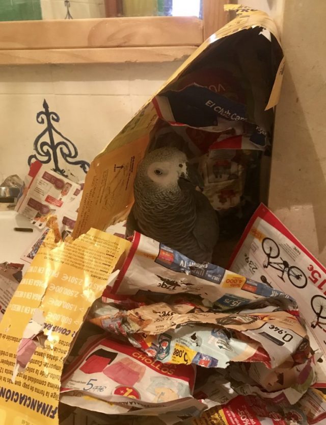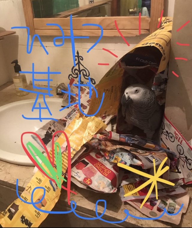 家に帰ると、オウムが「秘密基地」を作り上げていた。そして。ちらしで作った「かまくら」の中に、ほっこりと身を寄せていた。