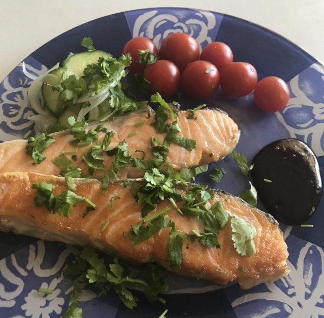さて、夕食のサーモン。ワンプレートディナー。基本的に「ももルール」にそって調理する。