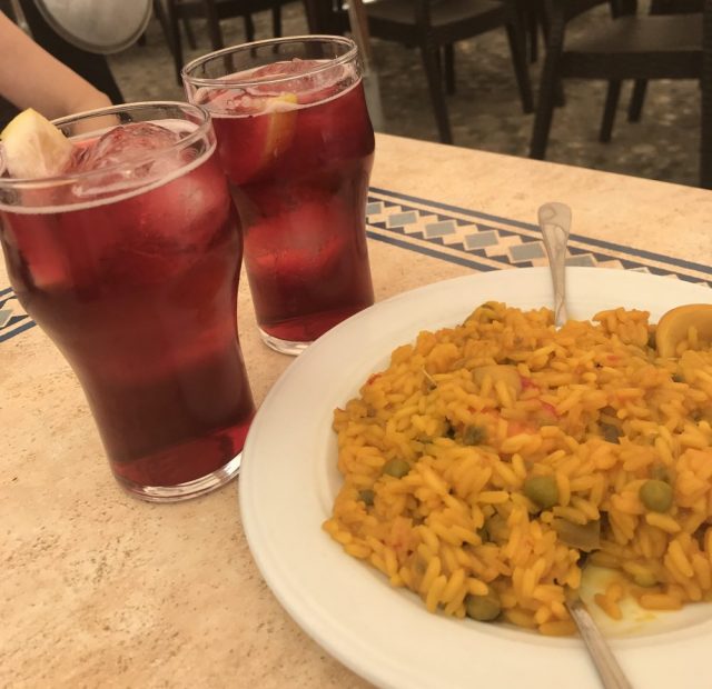 さて。喉の渇きをいやすため、広場のバルへ。ティント・デ・ベラノ(赤ワインのソーダ割り)を頼んだら、またタパスがついてきた(笑)それもパエリャ。