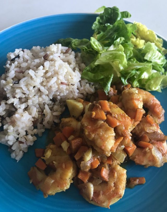 さて、帰宅後は頂きものの「エビ」でワンプレートディナー。ニンニク、生姜、クミン、ウコン、カレー粉、はちみつ入り。
