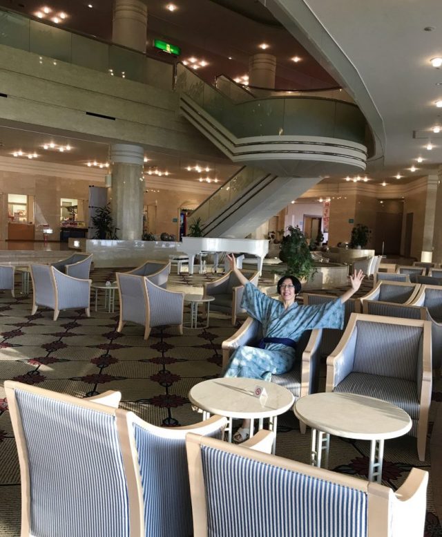 広々としたロビーからは、三河湾に沈む夕陽が。白いピアノも(笑)テンション上がる〜。あっという間に夕食の時間。お腹すいた〜!はてさて。
