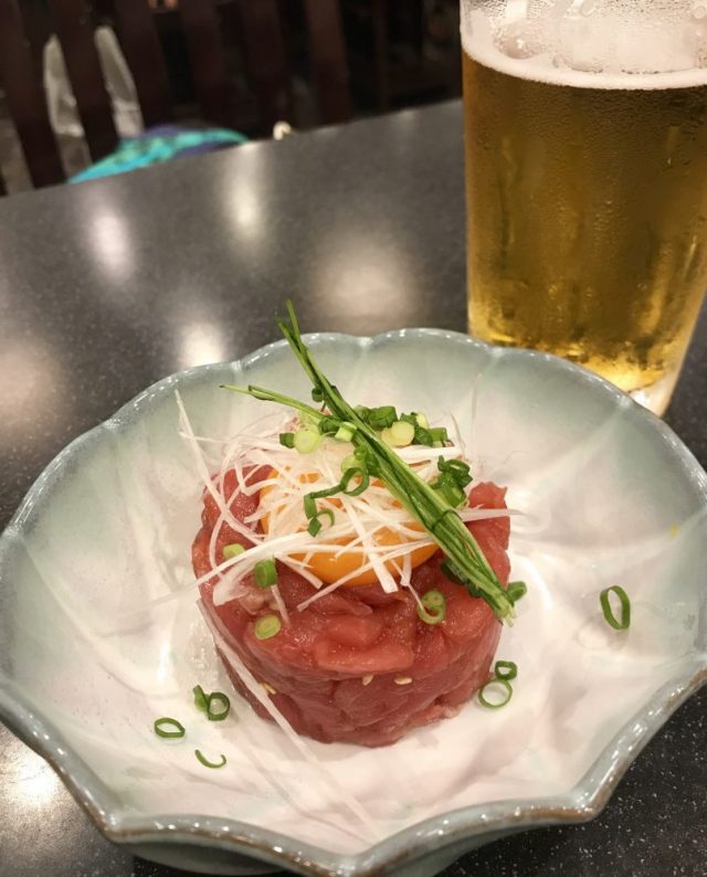 名古屋滞在初日。まずは会社員時代の友人・大木ちゃんと寿司ランチ。再会を祝ってビールで乾杯。お刺身やマグロのユッケを肴に。おいしい〜。