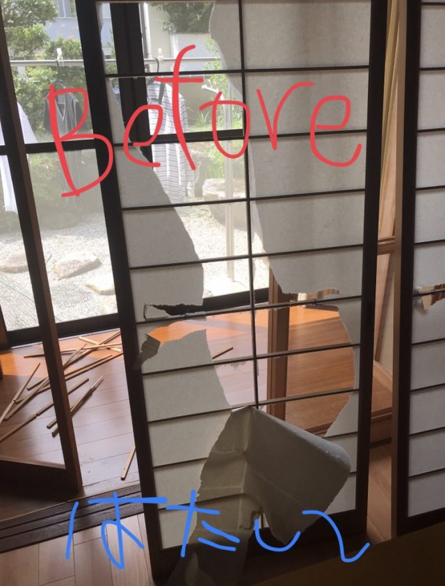 【日本滞在記】豪快自力リフォームは続く。純和風・築30余年の実家。障子をひっぺがし、格子模様を叩き切った後は、プラダンのカット&はめ込み。