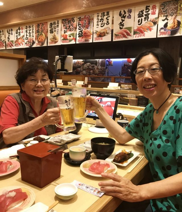 【日本滞在記】絵の大先輩である高井澄子先輩とランチ。まずは回転寿司へ。再会を祝って生ビールで乾杯!