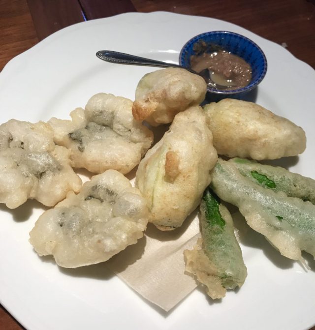 続いて登場の「はも、チーズ、オクラの揚げ物」これがまた絶品。見かけは地味。でも一口食べて驚きのおいしさ!一つ一つ異なる味や食感がたまらない。
