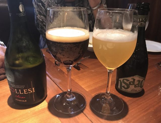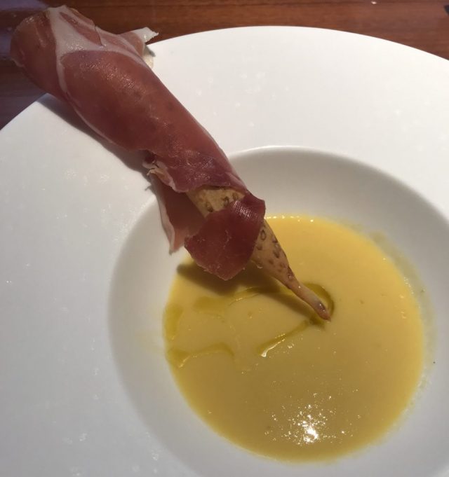 まずはイタリアンビールで乾杯!伊藤さん&中岡さん、お忙しいところ、おつきあいありがとうございます。スターターは「生ハム&とうもろこしのスープ」これがおいしい〜。