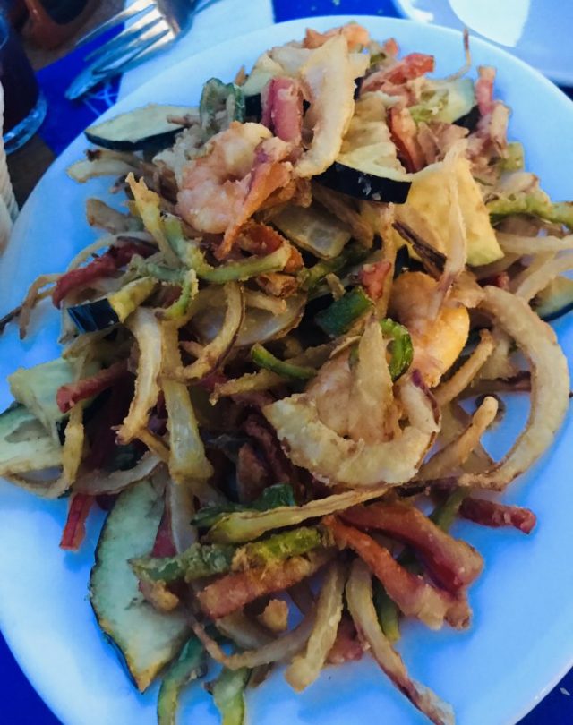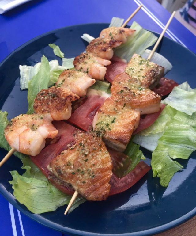 エビとサーモンの串焼き、野菜のフライなどをつまみながら近況報告。なにしろ一ヶ月分なので話は尽きない。