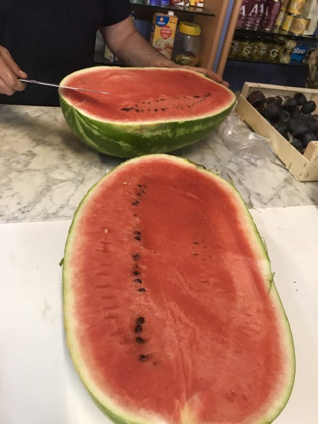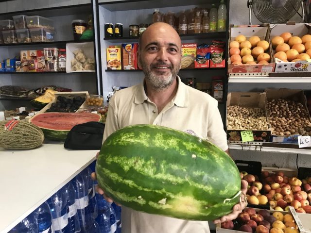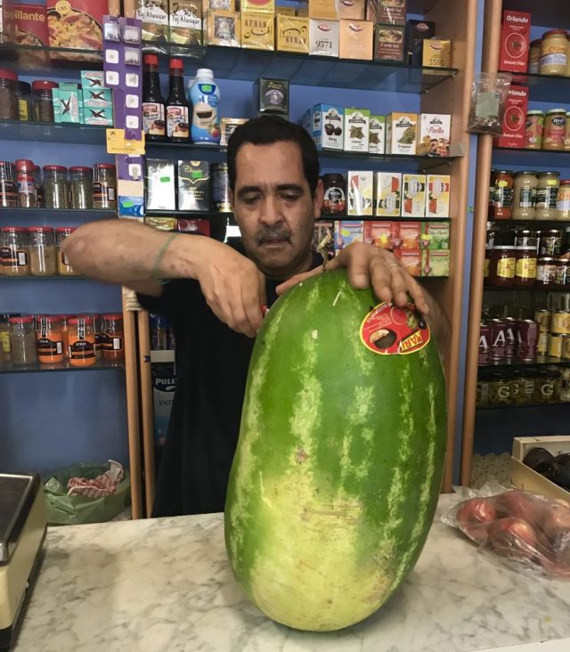 私がよく行くモロッコ人のおじさんがやっている八百屋さん。食料品を買いに行くと、なんと。巨大なスイカが店頭に!