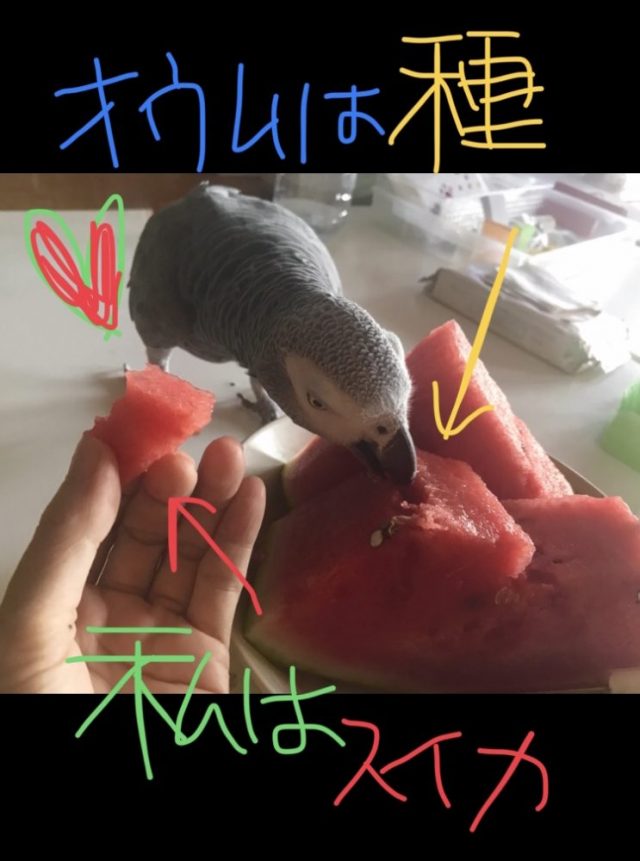 甘くてどれだけでも食べられる〜。その音を聞きつけ、オウムが飛んできた。