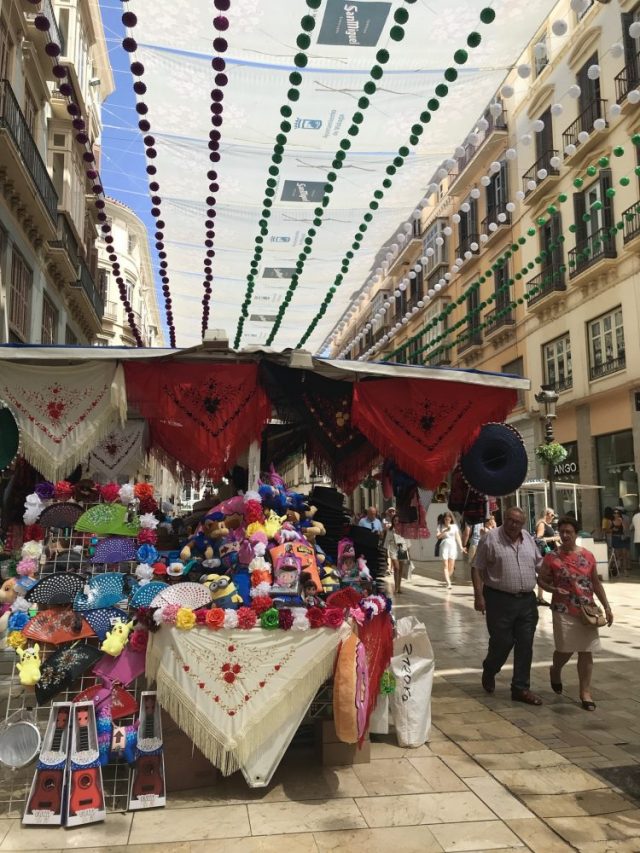 いよいよフェリア開始まであと数時間!ラリオス通りにはフラメンコアクセサリーを売るお店があちこちに。天幕も張られ、フェリアムードいっぱい。オーレ!