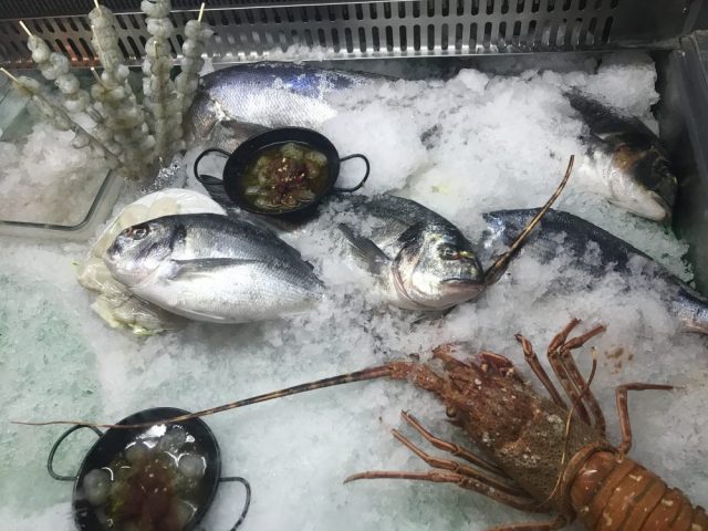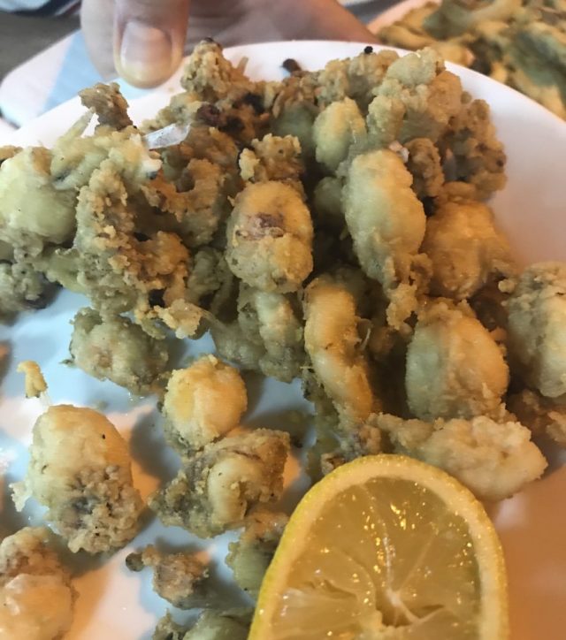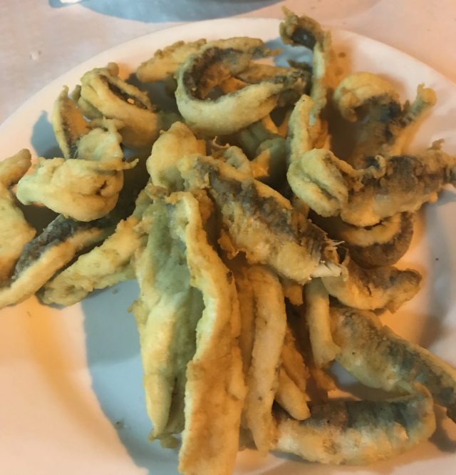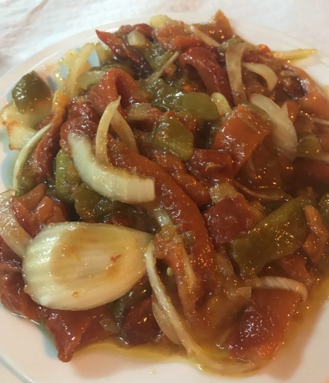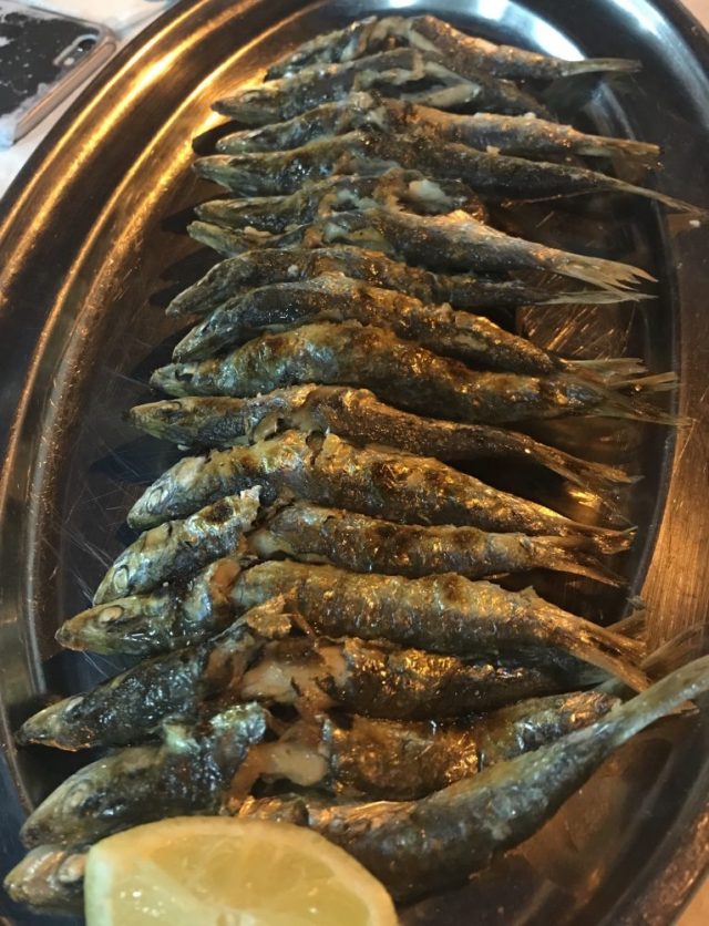 マラガの定番・焼きイワシでスタート。熱々がおいしい〜。さらにイカのフライ、魚のフライ、ピーマンのオーブン焼き・・・次々と料理が運ばれてくる。
