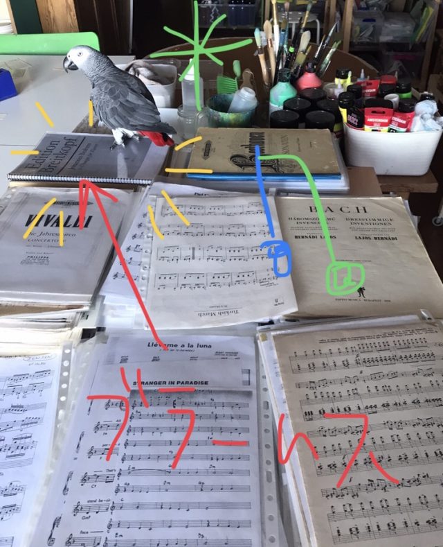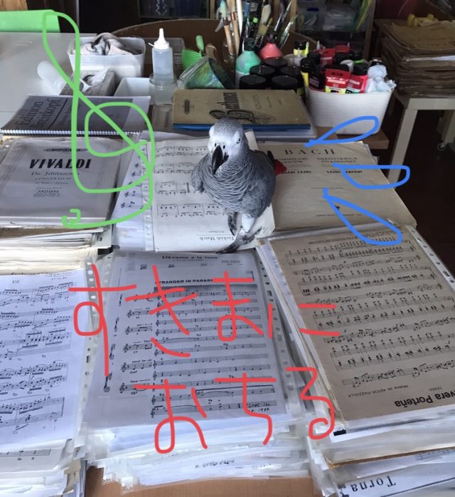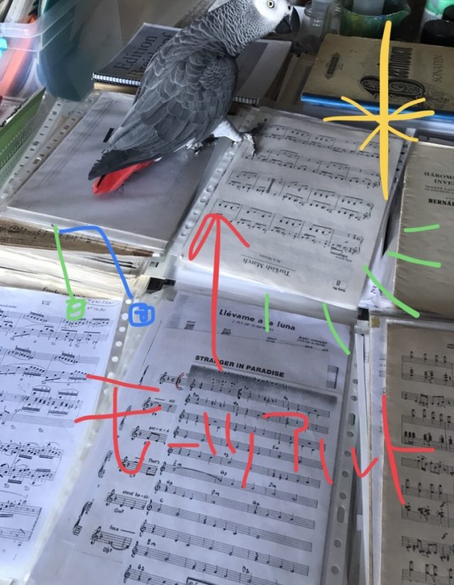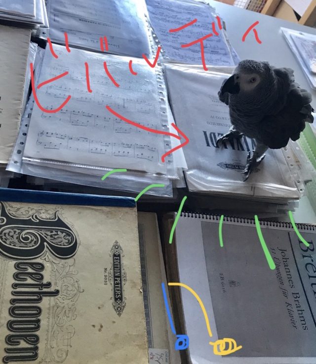 喜びの声を上げながら、楽譜の山を歩き回る。噛み切らない限り、まっいーかとほかっておく。段差が心地よいらしく、一つ一つ登頂。