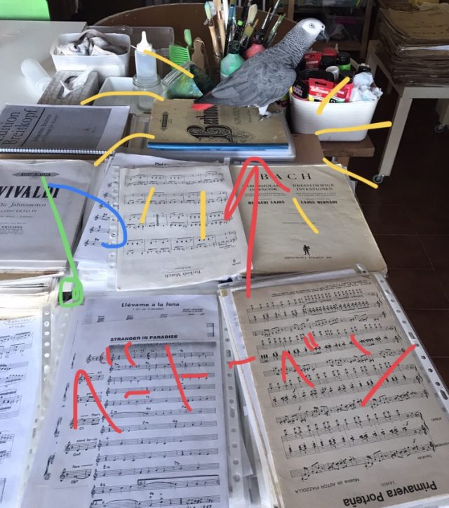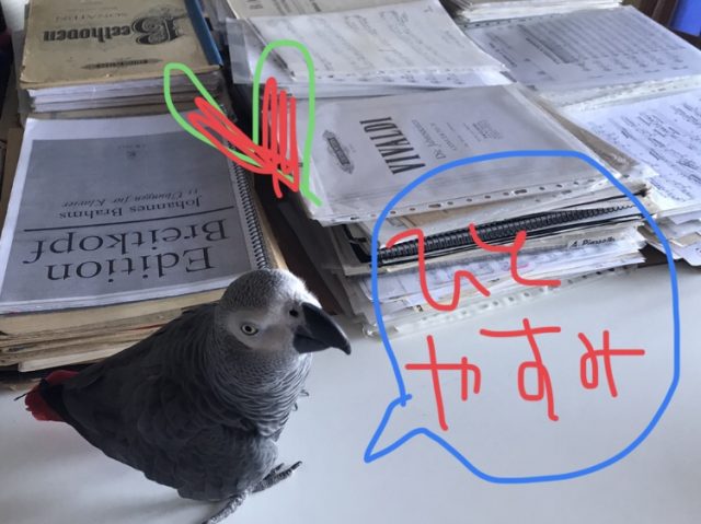 ジャンルごとに分け、山積みにしていると、さっそくオウムがやって来た。フェリアでほったらかしにされていたので、こんな楽しそうな機会を逃すはずはなく。