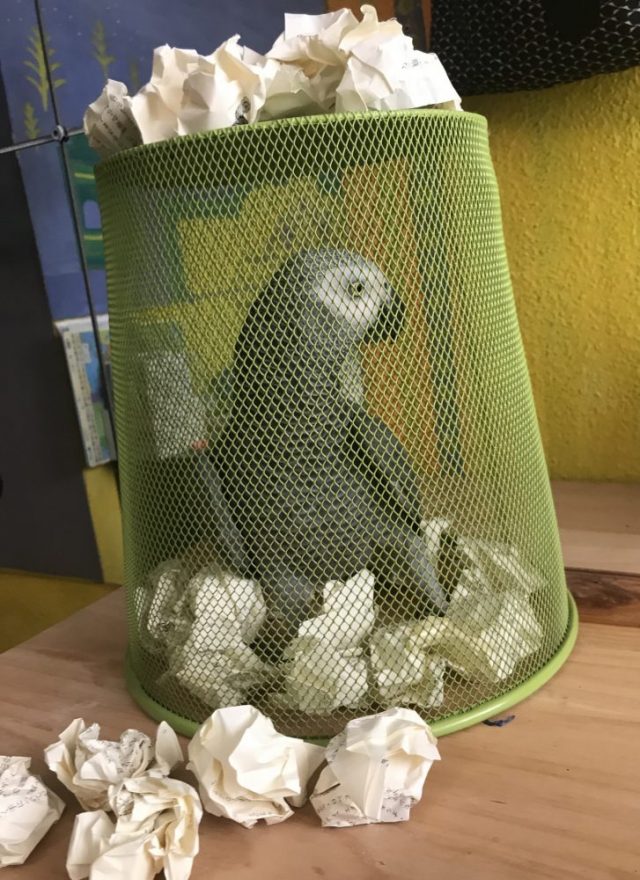 オウムが邪魔しに入るので、近くにあった「ゴミ箱」をかぶせてやった。少なくとも息はできるじゃろう。