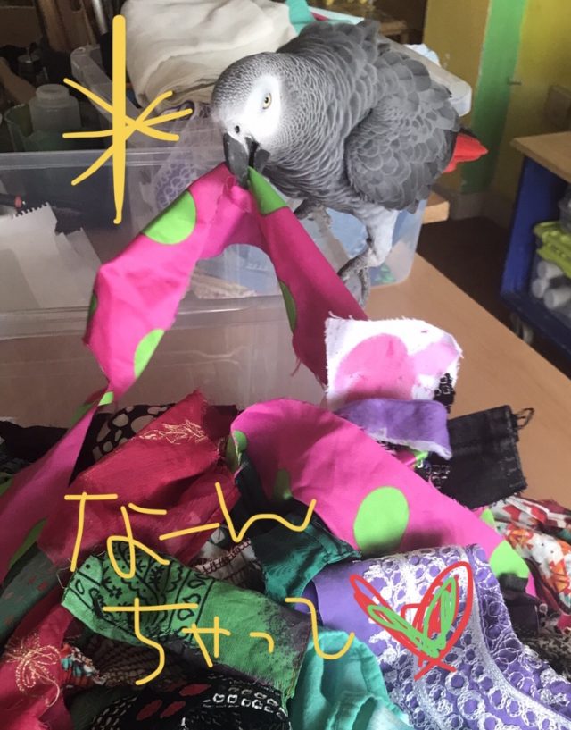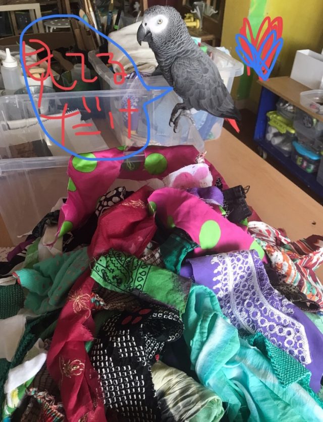 さて。「布の大整理」が終わり、5分の1まで量を減らすことに成功。なぜかオウムもこの大処分イベントに参加。呼んでないって。