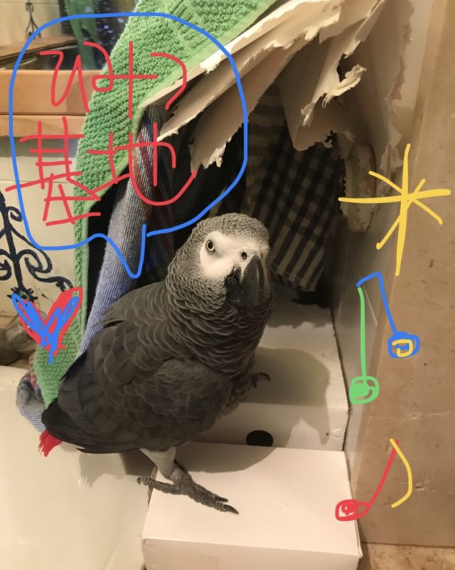 ところで。本日オウムには「秘密基地」を準備しておいた。だから、お利口さんに遊んでいるはずなのだが。はたして。