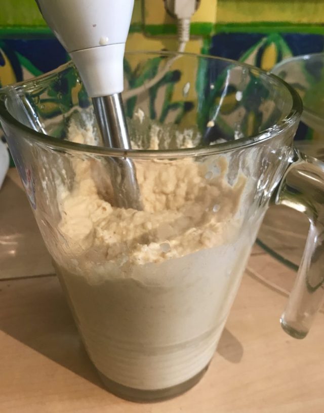 2・電動のバティドール(日本語では何?攪拌器?)で、ゆっくり1分。私はここで塩を追加。