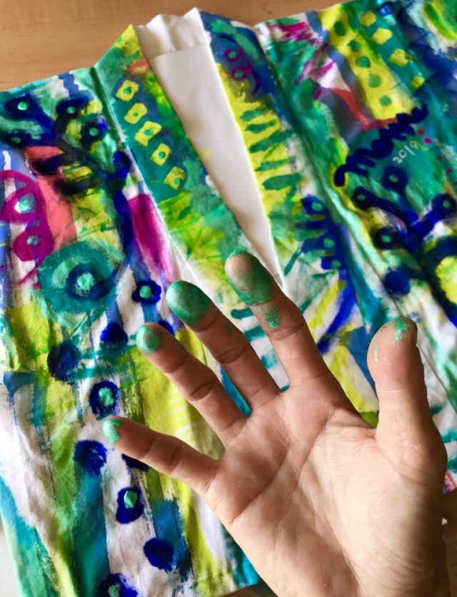 ポイントで「光るキラキラ絵の具」も使ってみた。やっぱ衣類には、シルバーやメタリック絵の具がいい。動きや光によって、微妙に表情を変える。