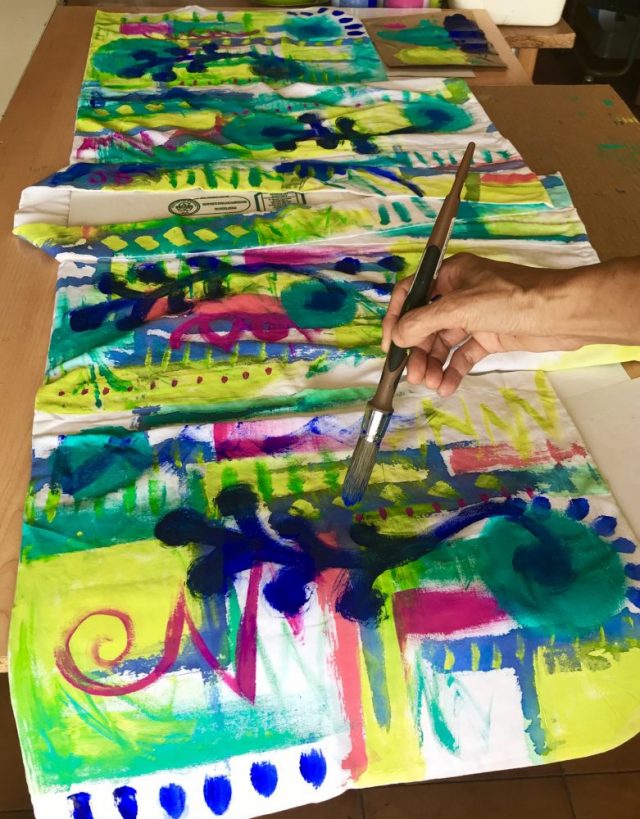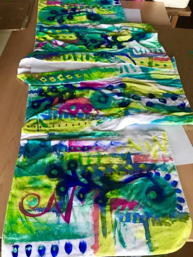 大須のコメ兵で買った浴衣。ざっくりウエストでカットし、まず表側からペイント開始。大まかに描きたいので、ホームセンターで入手したハケで(笑)。