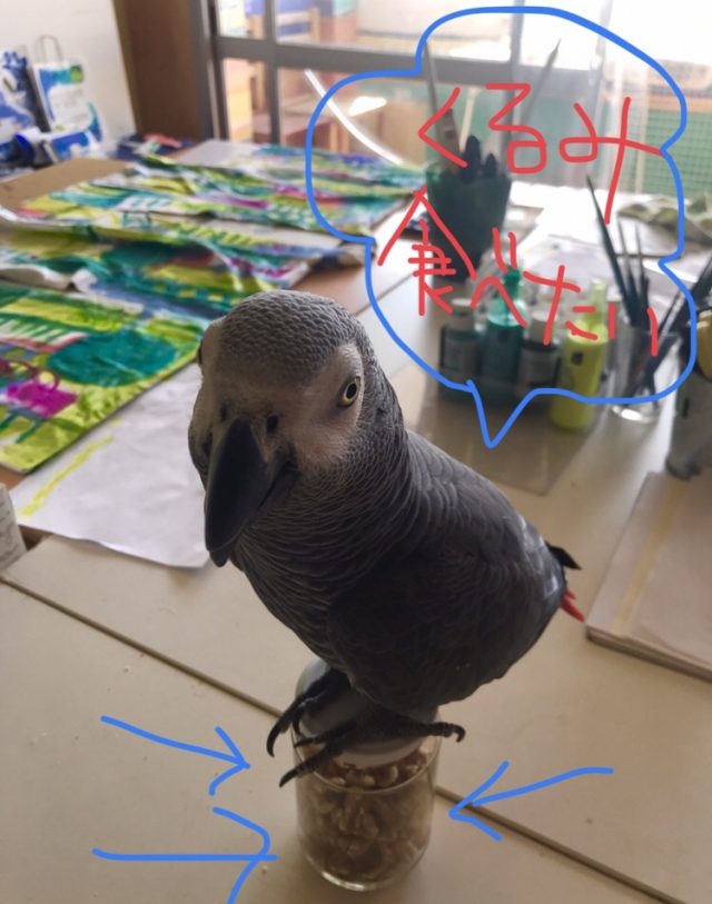 ハケやら手やらで夢中になって塗っていたら、オウムが「クルミのボトル」の上に乗っていた。