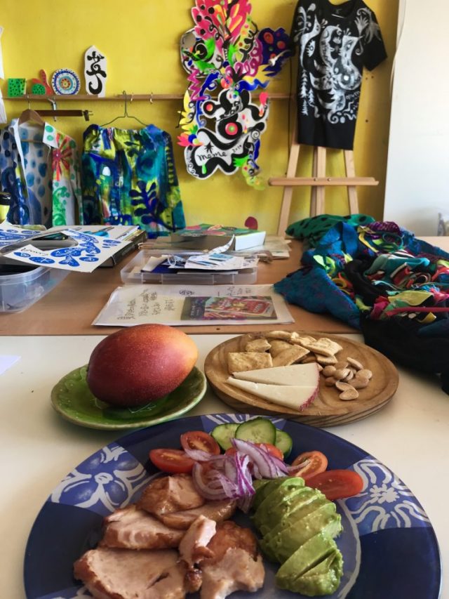 さて。アトリエ暮らしが再開し、作業テーブルの隙間でランチ。デザートはマンゴー。これがおいしい〜。マラガはマンゴーの産地なので、一個100〜250円で買えるのだ。