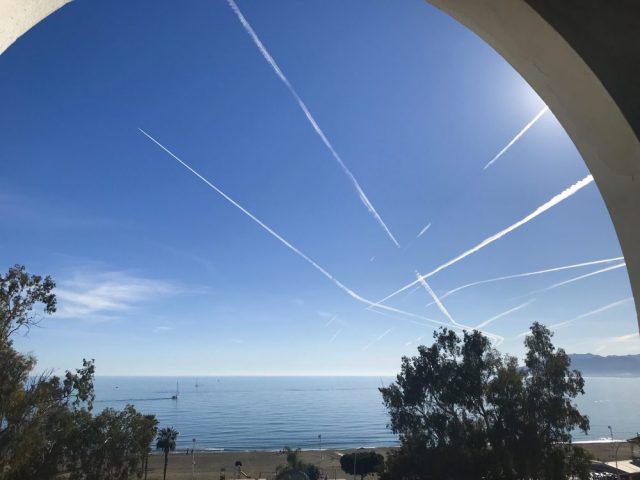 ケムトレイルなのか。何かを撒かれているのか。マラガの雲ひとつない青空に