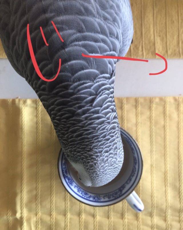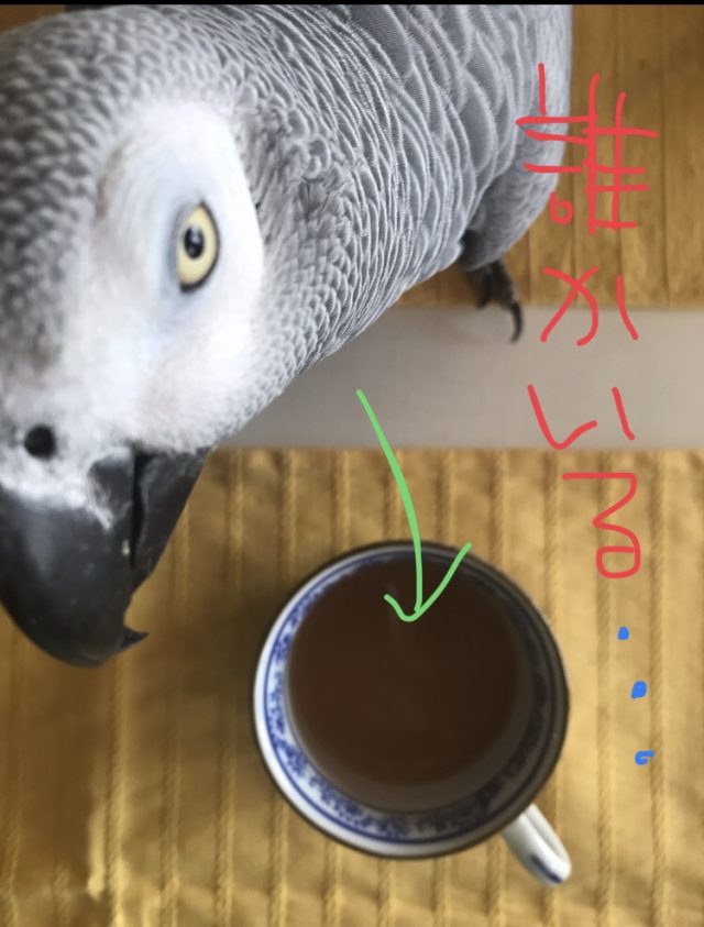 本日のオウムは「カップに夢中」であった。私の紅茶を盗み飲みしようと、カップの中に頭を突っ込んだとたん