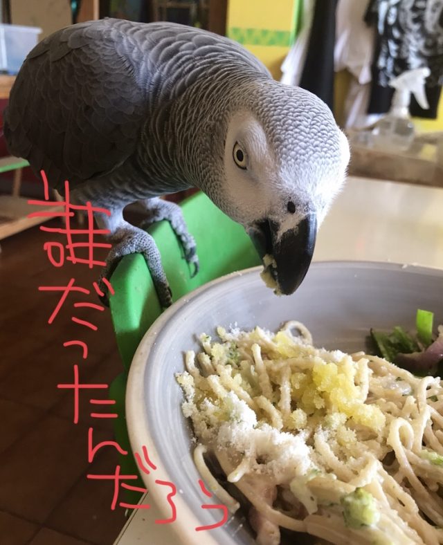 ランチになっても、表情は変わらず。私のパスタを盗み食いしながら