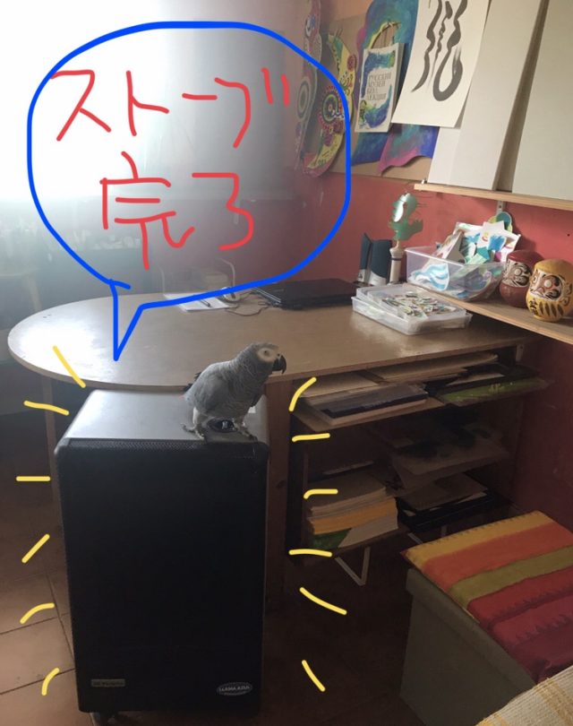 マラガにも秋の到来。朝夕はめっきり涼しくなった。まずはストーブを出して掃除&点検。それを見たオウムがものすごい勢いで飛んでくる。