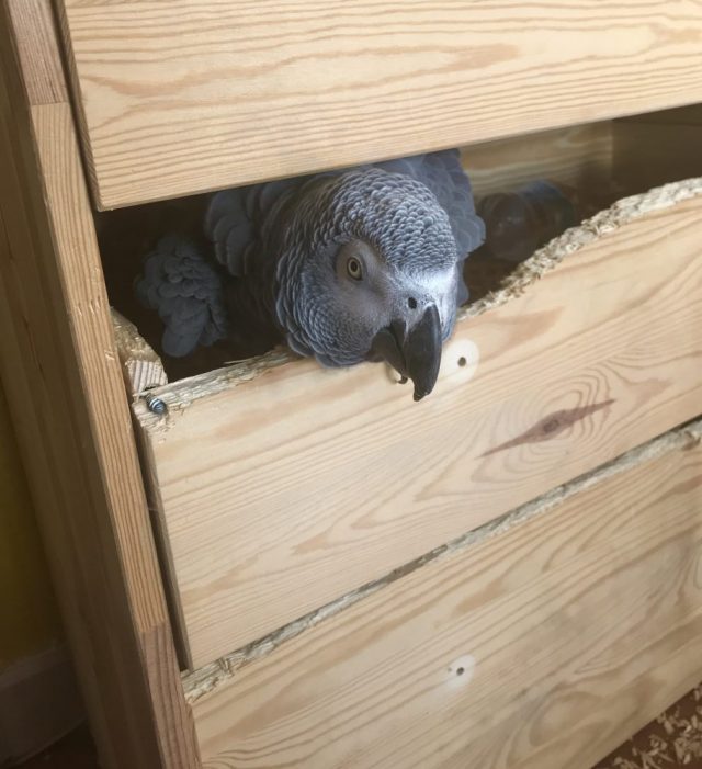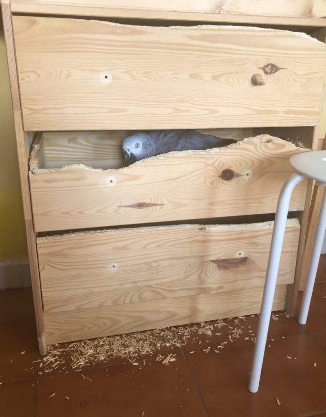 「テレサ叔母さん。今日はオウムが引き出しの中に!」