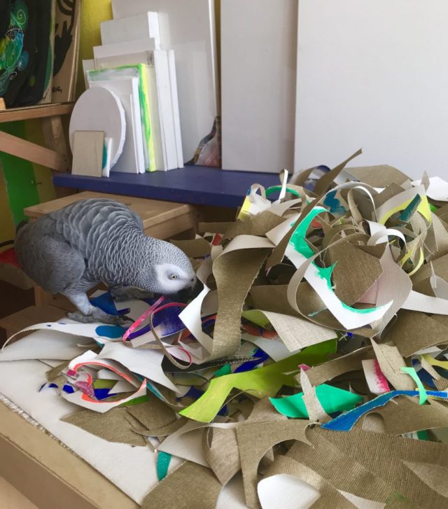 今日もオウムは朝の8時からアトリエへ出勤。とにかく画材に興味津々。作業テーブルをふらふらと歩き回り、不思議なものにくちばしをのばす。