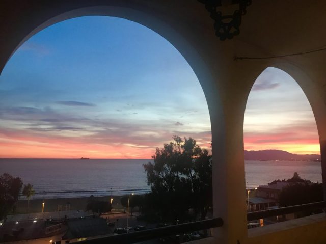 水平線がゴールドサーモン色に染まる。日が落ちると色がわからないので、今日はここまで。明日も裏面コラージュ制作を進めよう。
