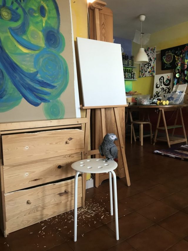 さて。先日、寝室の「三段引き出し」を5時間かけてボロボロにしてくれたオウム。「ここまでしたなら」と、アトリエに移動。大きいサイズの絵を描く「台」として使用することに。