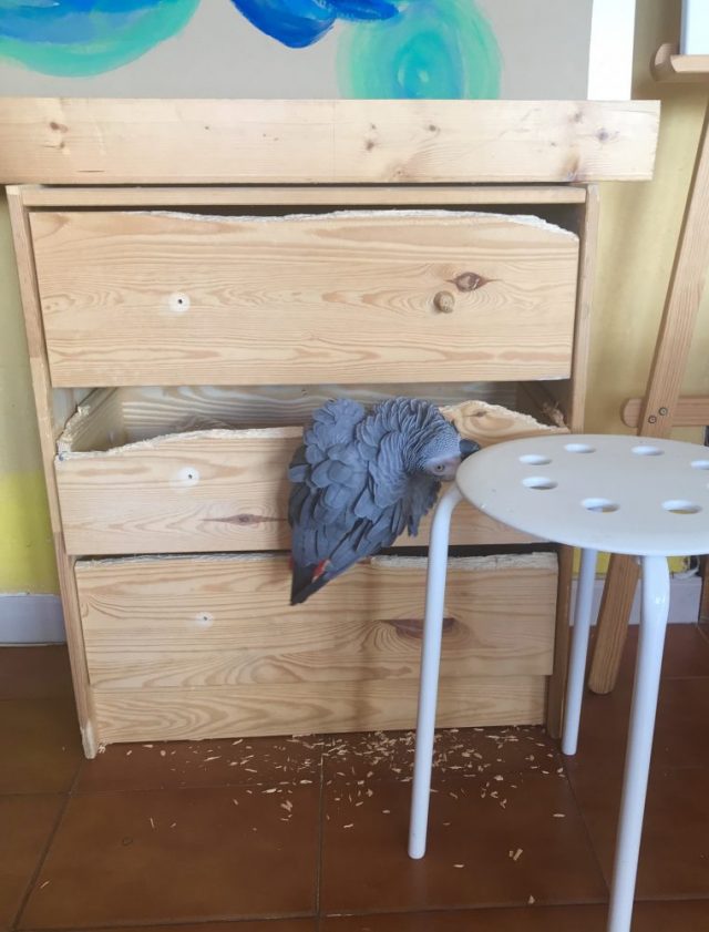 オウムは今日も「二段目の引き出し」に没頭していた。おかげで、私はコラージュ制作に一日中集中。家具がボロボロにされるのは確かに困る。が、それ以上の
